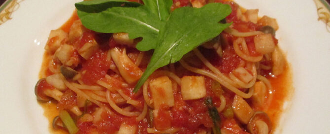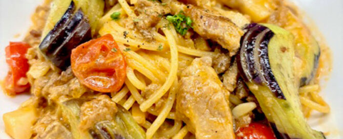 カリカリに焼いたバラ肉のから滲み出るラードをしっかりと含ませた旬の秋茄子。トマトの酸味で合わせ、クリームパスタに仕上げました。