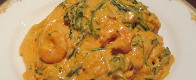 ほうれん草と海老のトマトクリーム:自家製のトマトソースとクリームチーズを合わせ、旬のほうれん草と海老を使った。トマトクリームパスタに仕上げました。