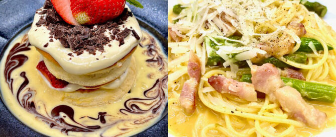 2月はアスパラとパンチェッタの柚子カルボナーラとたっぷりカスタードのミニパンケーキをお薦めします。