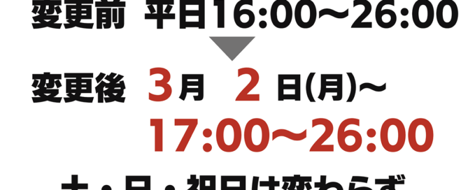いつもご利用ありがとうございます。時代屋オウンウェイは、3月2日(月)より平日の営業開始時間が17時に変更となります。