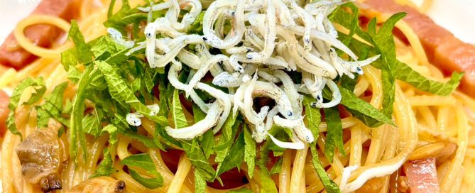 シラスと大葉の和風パスタ:旬を迎えるアサリをバター醤油で炒めシラスと大葉を散らしました。