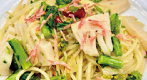 菜の花と筍のアーリオオーリオ 旬野菜に桜エビを添え、春の演出溢れる一皿に仕上げました。 [...]