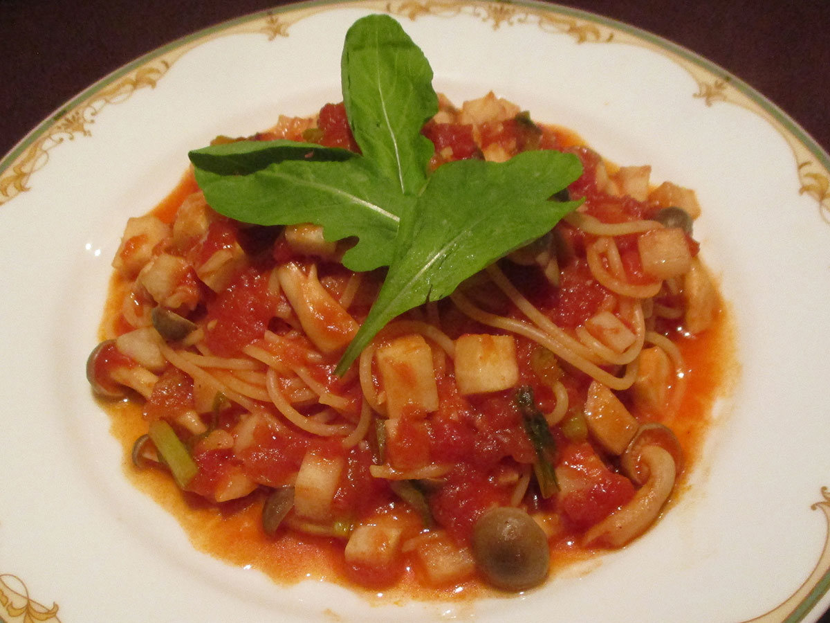 秋が旬の蕪(かぶ)、エリンギ、しめじをトマトソースで煮込み、ルッコラを添えました。