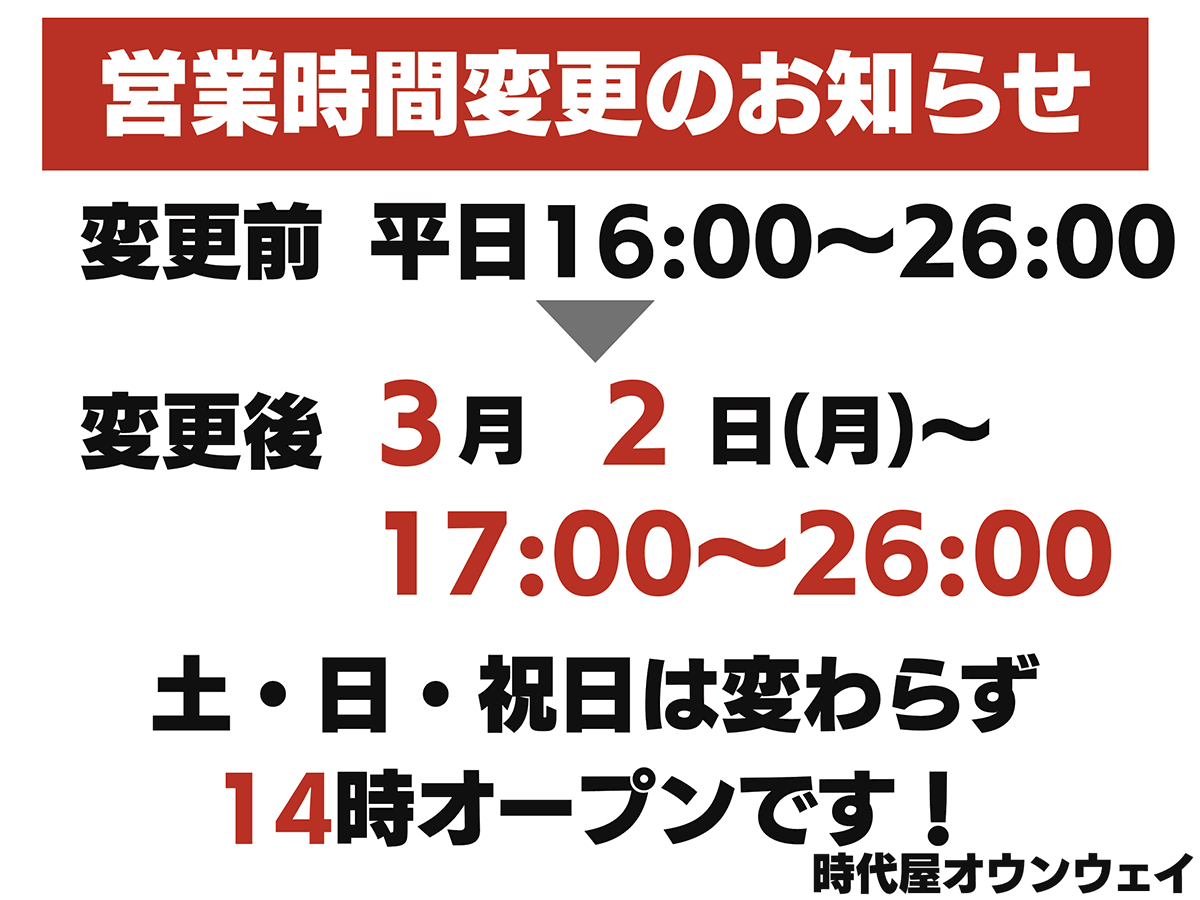 いつもご利用ありがとうございます。時代屋オウンウェイは、3月2日(月)より平日の営業開始時間が17時に変更となります。
